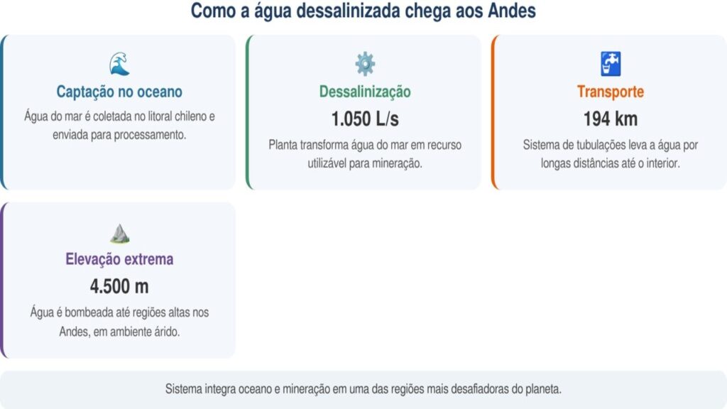 O sistema conta com uma planta de dessalinização capaz de processar 1.050 litros por segundo, instalada no litoral chileno. A estrutura transforma água do mar em recurso utilizável para a mineração. Veja detalhes: