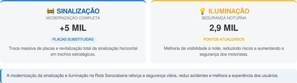 A modernização da sinalização foi uma das prioridades da concessão, com a troca de mais de 5 mil placas e revitalização completa da sinalização horizontal em diversos trechos estratégicos. Veja os detalhes: