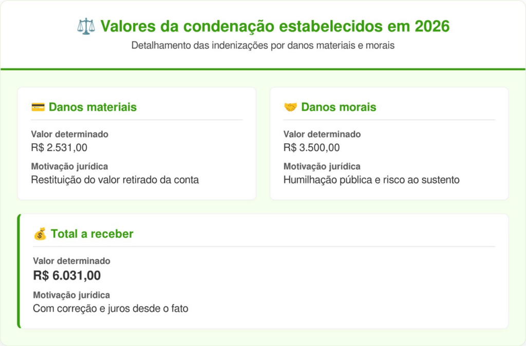 Sem dinheiro para os alimentos e diante do constrangimento público no caixa, a vítima acionou a Justiça. De acordo com informações sobre a responsabilidade civil, o magistrado entendeu que a situação ultrapassou o “mero aborrecimento”, ferindo a dignidade e o sustento do cidadão.