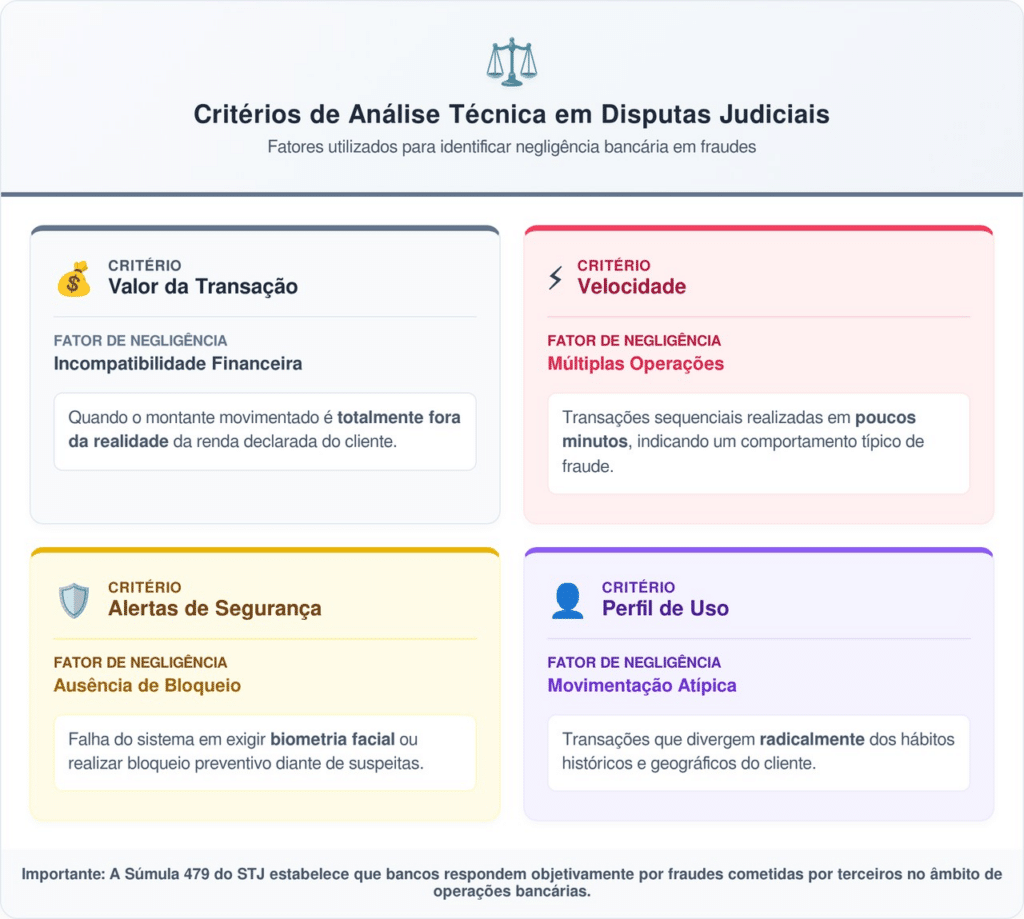 No tribunal, a empresa tentou atribuir a culpa exclusivamente ao consumidor, alegando que as operações foram voluntárias. Contudo, o juiz entendeu que os bancos possuem a obrigação tecnológica de identificar transações que destoam completamente do padrão de consumo registrado no histórico da conta.