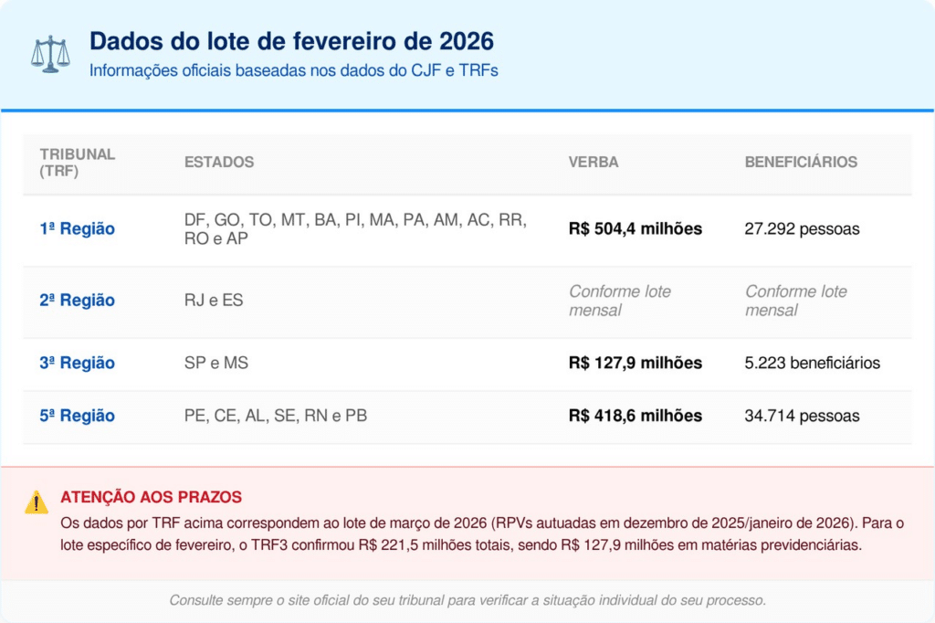 A distribuição ocorre conforme o volume de processos em cada tribunal. Confira os dados do lote de fevereiro de 2026, com base em informações oficiais do CJF e dos próprios TRFs: