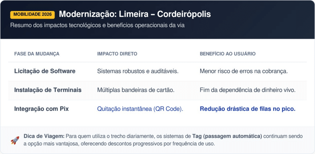 A Secretaria de Mobilidade Urbana coordena a transição para os novos métodos. O processo envolve a aquisição de tecnologia adequada através de licitação, garantindo sistemas seguros contra fraudes. Veja abaixo o resumo dos impactos esperados com a modernização tecnológica da via entre Limeira e Cordeirópolis: