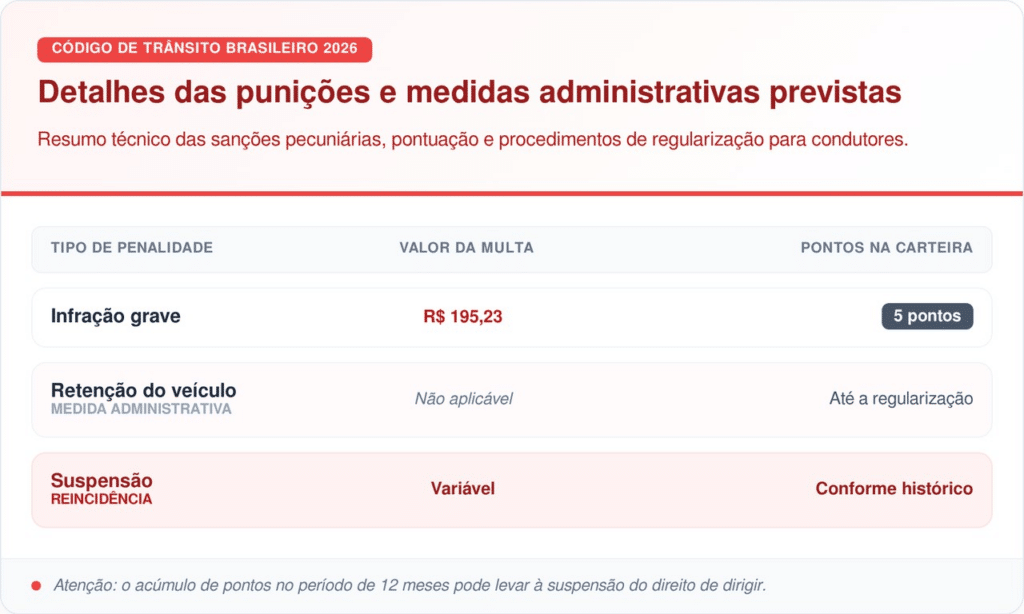 Em casos de reincidência ou situações de risco extremo, o veículo pode ser retido para regularização imediata. Para visualizar o impacto das penalidades e os valores envolvidos no sistema de pontuação da CNH, acompanhe o quadro comparativo abaixo: