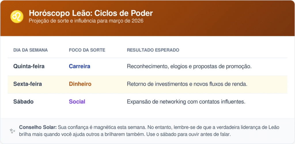 Os nativos de Leão recebem um influxo de visibilidade que acelera respostas pendentes em processos seletivos ou promoções. A sorte para este signo se manifesta através do brilho pessoal, tornando-o irresistível para novos parceiros de negócios e investidores atentos.