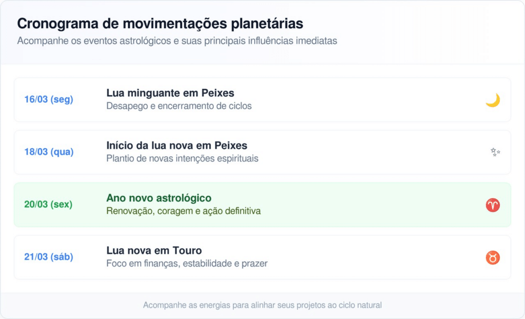 O período inicia sob a influência da Lua Minguante em Peixes, ideal para limpezas emocionais, e culmina na grande virada do zodíaco. Na sexta-feira, dia 20, o Sol ingressa em Áries, marcando oficialmente o início do novo ciclo regido por Marte e a troca de estações no Hemisfério Sul.