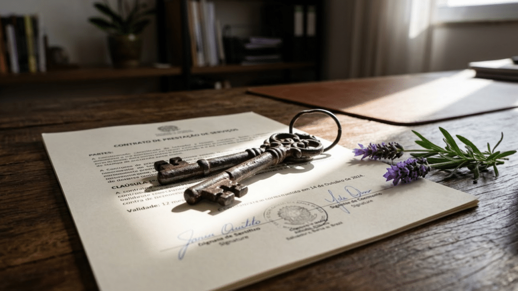 Chaves antigas sobre contrato assinado simbolizando abertura de caminhos