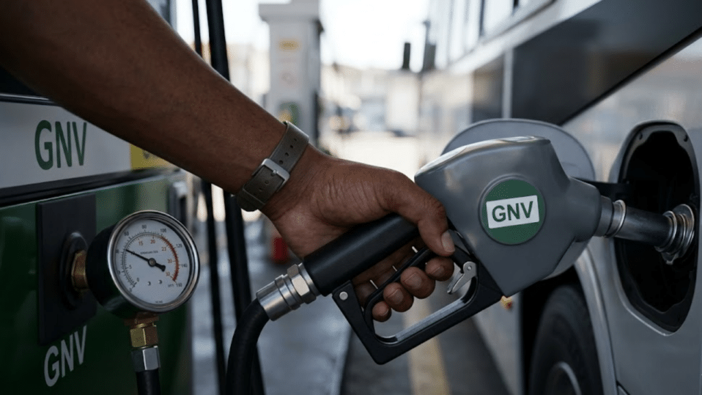 Frentista acionando bico de GNV, foco em textura e rapidez (Imagem Ilustração)