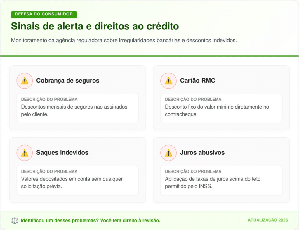A identificação do erro depende da análise atenta dos extratos de empréstimos ativos no histórico do segurado. Valores depositados sem autorização via cartão de crédito, que geraram juros automáticos, são o principal indicativo de que houve uma prática abusiva da instituição.