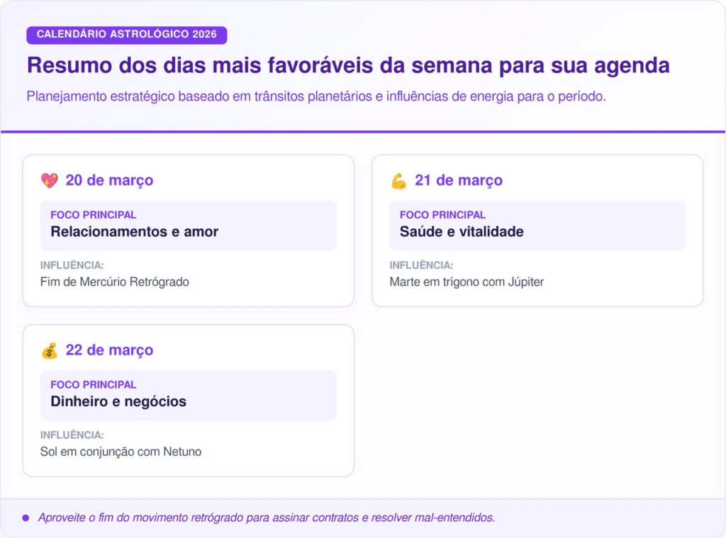 Essas datas são pontos cegos ou de luz, dependendo de como cada signo se posiciona diante das oportunidades apresentadas pelo universo. Para entender como aplicar isso na prática e organizar sua agenda, acompanhe o resumo dos dias mais favoráveis da semana: