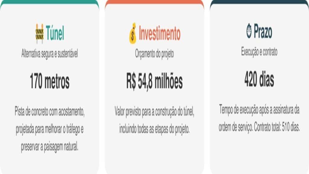 O projeto prevê um túnel de 170 metros com pista de concreto e acostamento, considerado a alternativa mais segura e sustentável para o Portão do Inferno. A obra promete melhorar o tráfego e preservar a paisagem natural. Veja os detalhes do projeto:
