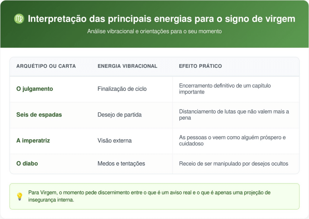 Como a energia de Capricórnio aparece influenciando o fundo do seu baralho, recomenda-se que o virginiano também busque mensagens complementares neste signo, pois a revisão de valores essenciais será um tema compartilhado. O momento pede que você analise o que realmente deseja para sua residência emocional e planos de longo prazo.