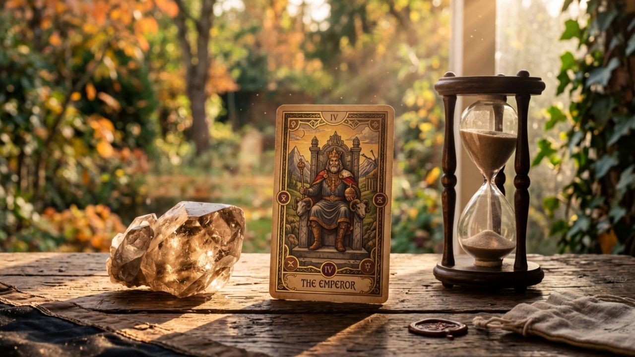Carta de tarô e cristal sobre mesa de madeira sob luz dourada