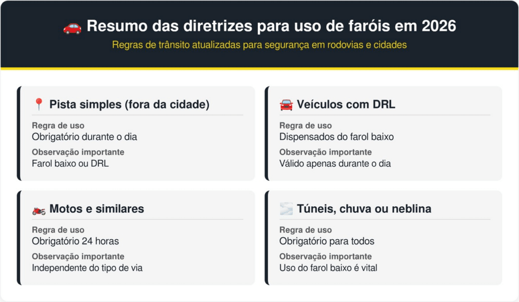 A legislação brasileira evoluiu para contemplar novas tecnologias e categorias de veículos. Atualmente, a obrigatoriedade foca onde o risco de acidentes é estatisticamente maior, mas mantém diretrizes rígidas para situações de visibilidade comprometida por fatores climáticos ou infraestruturais.​