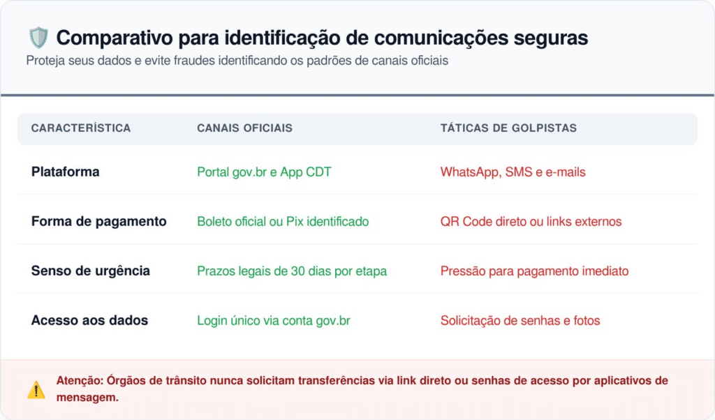 As multas legítimas sempre estarão disponíveis para consulta no portal do Detran do estado onde o veículo foi registrado. Se o débito não aparecer no sistema oficial ou no aplicativo da Carteira Digital de Trânsito, a probabilidade de se tratar de uma tentativa de golpe é altíssima.