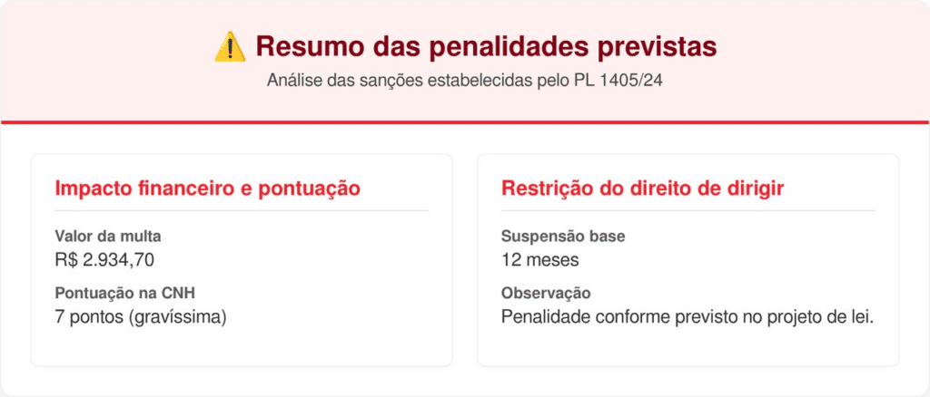 Em casos de reincidência no período de um ano, a suspensão da CNH pode chegar a 24 meses. Para entender a gravidade das novas medidas, veja o comparativo das punições administrativas propostas pelo novo texto legal: