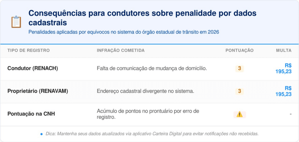 Manter os dados antigos no sistema gera um efeito cascata de prejuízos regulatórios. Confira na tabela abaixo as consequências diretas para Condutores sobre penalidade de R$ 195,23 decorrente de equívoco frequente nos dados cadastrais no sistema do órgão estadual: