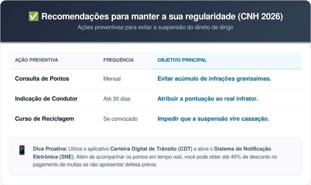 A melhor prevenção contra a CNH zerada é o acompanhamento constante da pontuação através do aplicativo Carteira Digital de Trânsito. Em 2026, a notificação eletrônica é considerada prova legal, e alegar desconhecimento de multas não suspende a abertura do processo de cassação administrativa.