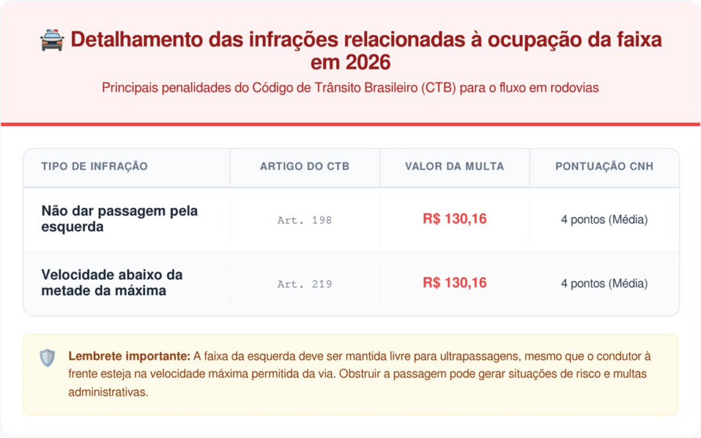 Confira na tabela abaixo o detalhamento das infrações relacionadas à ocupação da faixa em 2026: