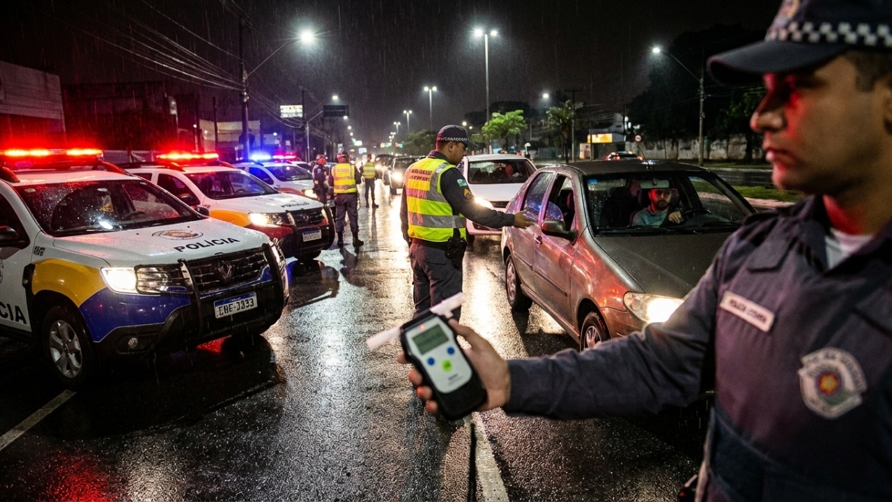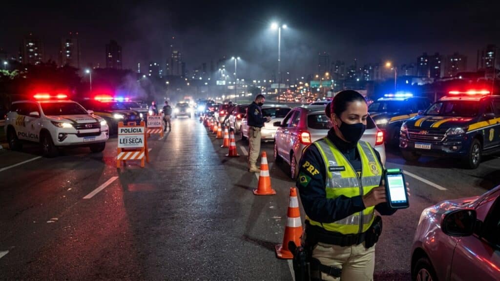 Blitz da Lei Seca com luzes de viatura e bafômetro em destaque