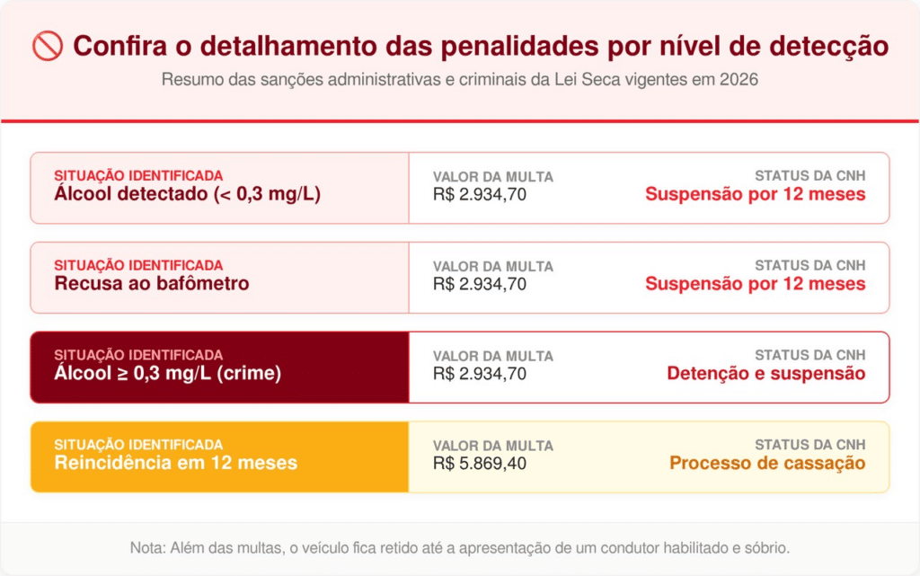 Além do prejuízo direto, o motorista reincidente frequentemente responde por crime de trânsito se o nível de álcool for superior a 0,3 mg/L. Veja abaixo como as autoridades escalonam as punições de acordo com a gravidade da situação detectada nas blitzes de 2026.