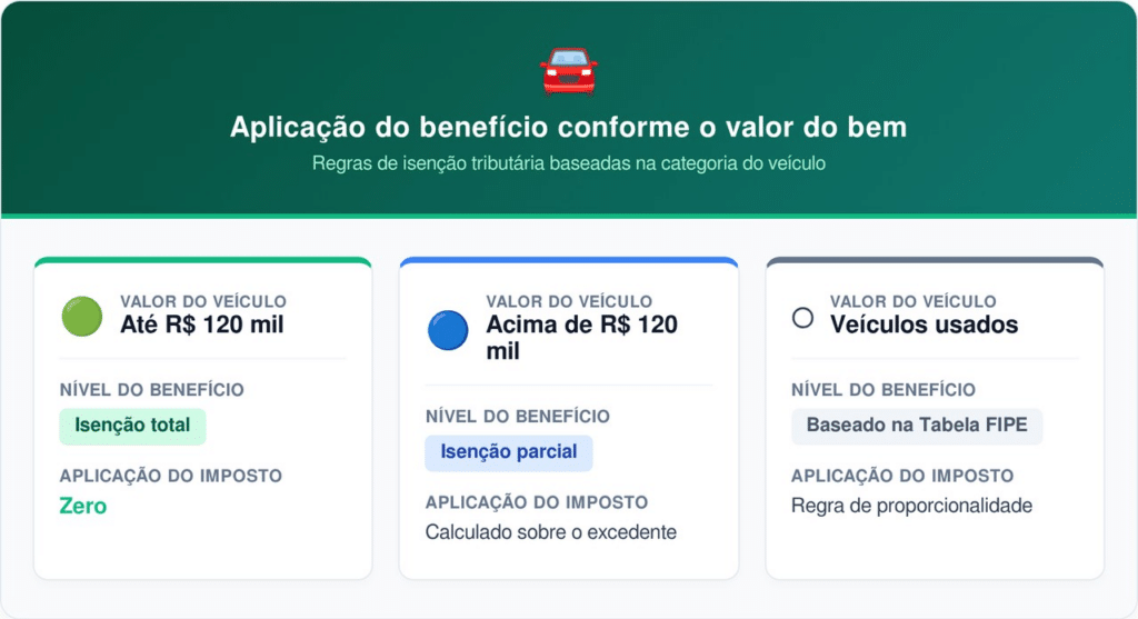 A lei estabelece um modelo de dispensa parcial progressiva para evitar distorções no mercado automotivo. O benefício integral cobre veículos até um teto específico; acima deste montante, o imposto é calculado proporcionalmente sobre a diferença, permitindo que o auxílio alcance carros médios sem contemplar modelos de luxo.