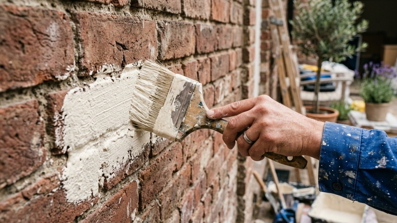 Homem aplicando a tinta de rejunte em uma parede de tijolos com uma brocha