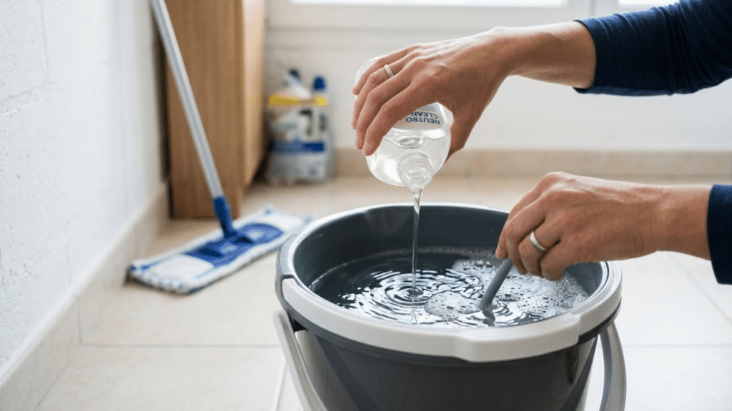 Diluindo produto de limpeza neutro em um balde com água morna