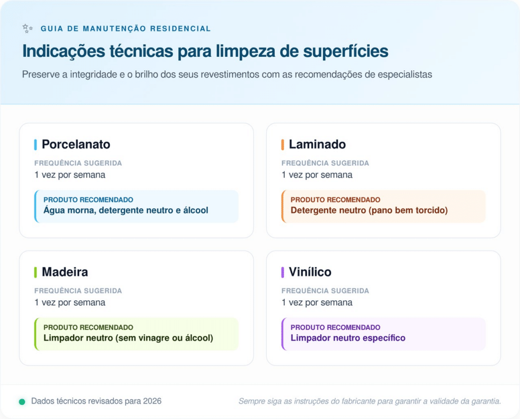 Utilizar uma substância incorreta é um dos erros mais comuns e pode acarretar danos irreversíveis, como a perda definitiva do brilho. A escolha deve considerar se a superfície é porosa ou impermeável, ajustando a diluição para evitar que o chão fique escorregadio ou opaco após a secagem.