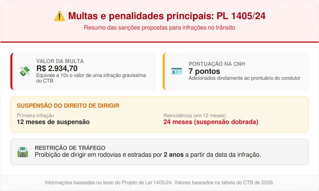 O debate sobre uma nova norma de trânsito ganhou força no Brasil com o avanço do Projeto de Lei 1405/24. Em discussão ao longo de 2026, a iniciativa busca elevar o rigor contra condutas perigosas, estabelecendo punições financeiras severas para quem desrespeita as regras de circulação nas rodovias e perímetros urbanos.