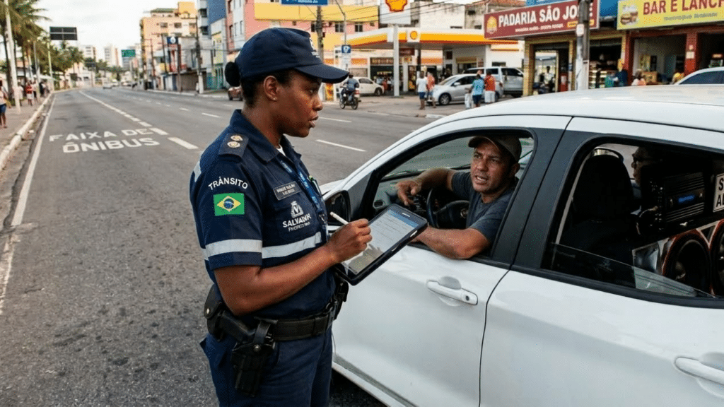 Oficial de trânsito multando motorista brasileiro por causa de som alto