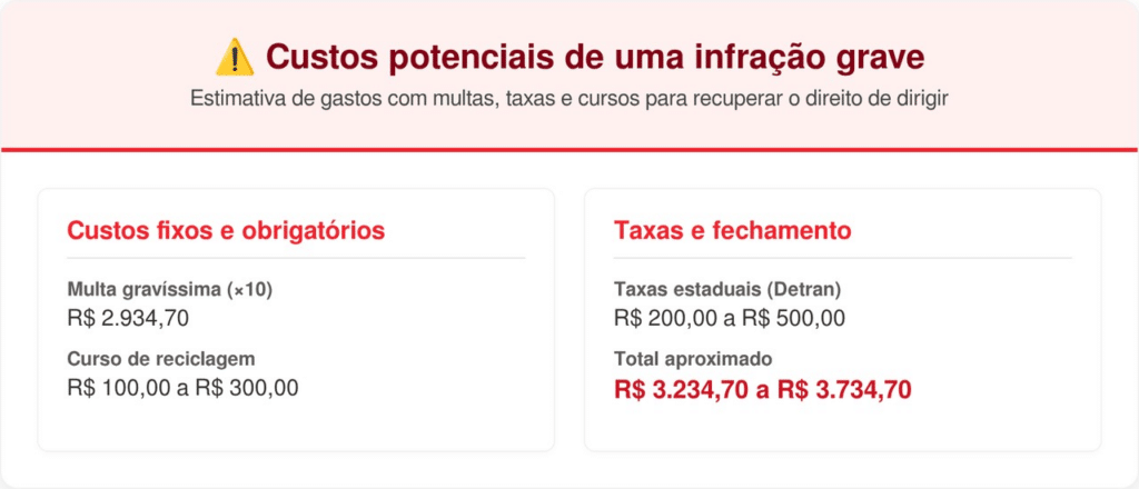 Além da multa, o condutor terá gastos com taxas de suspensão e cursos obrigatórios para recuperar o direito de dirigir. Veja os custos potenciais de uma infração grave: