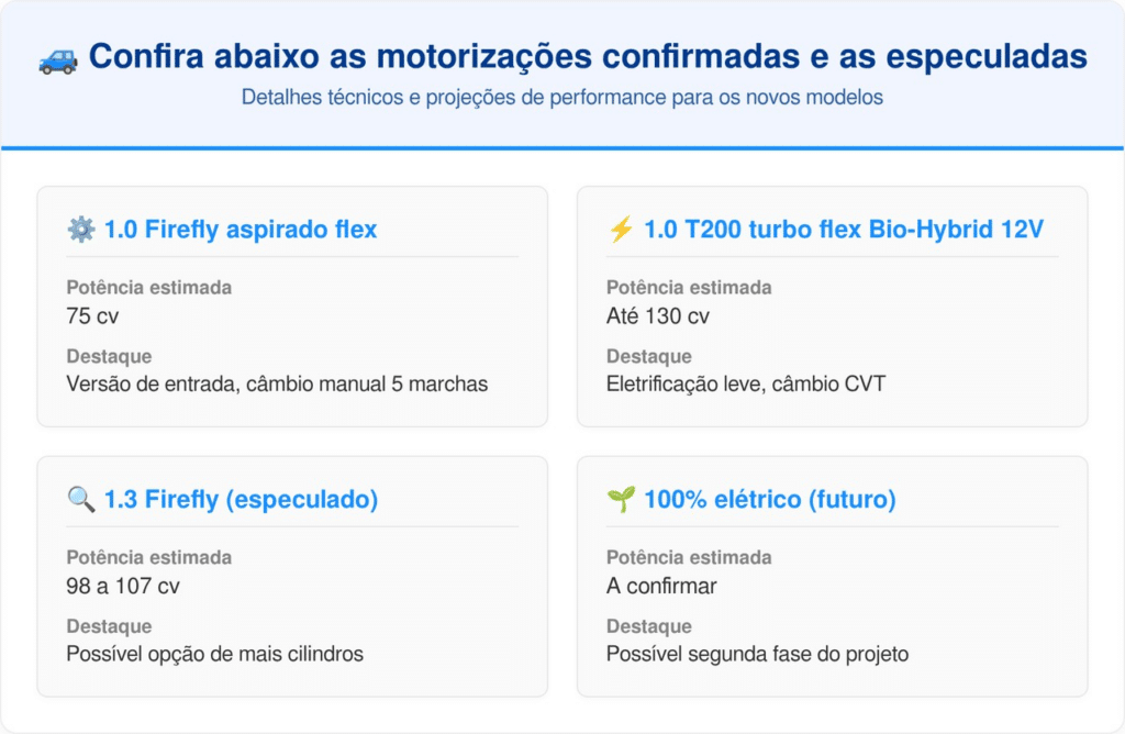 A grande aposta da Stellantis reside na estreia do sistema híbrido leve no segmento de entrada. O motor 1.0 T200 Turbo Flex, auxiliado por eletrificação leve de 12V, promete entregar agilidade urbana com consumo reduzido. A versão de entrada contará com o 1.0 Firefly aspirado de 75 cv, enquanto o motor 1.3 Firefly não é prioridade confirmada para o modelo, mas pode aparecer como opção futura.