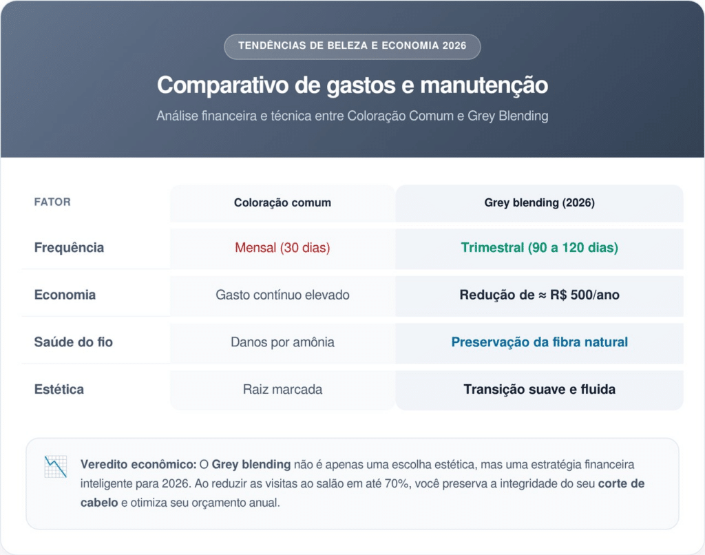 O grey blending é a técnica favorita de 2026 para quem deseja assumir os fios brancos com elegância. O método permite uma transição suave, reduzindo as visitas ao salão e gerando economia real.
