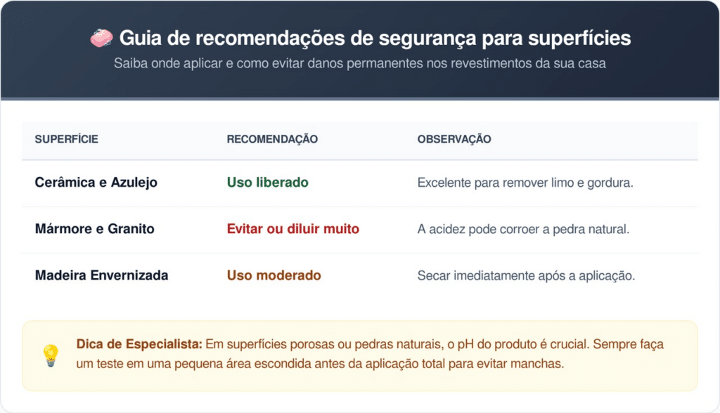 Apesar de natural, a acidez do produto exige cautela em superfícies de mármore, granito ou pisos de madeira encerada. Antes de adotar a rotina, é recomendável realizar um teste em uma pequena área escondida para garantir que o vinagre branco não causará manchas ou perda de brilho no revestimento.