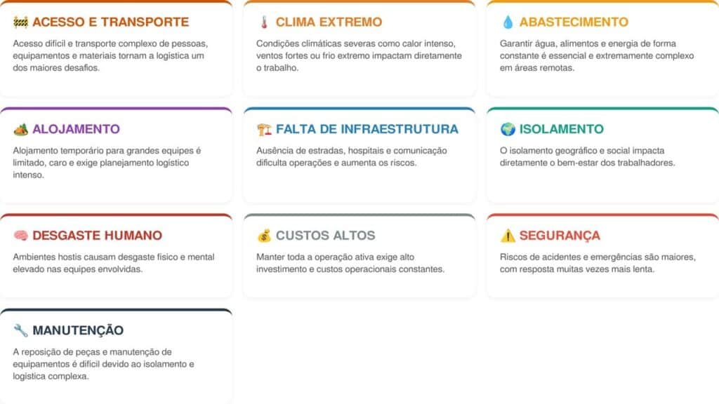 A rotina em obras remotas é marcada por dificuldades físicas e emocionais. O isolamento é um dos principais fatores, especialmente em regiões desérticas ou ilhas isoladas.