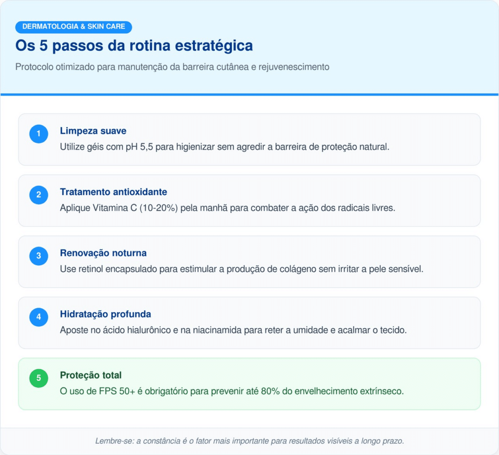 A construção de uma rotina estratégica envolve passos que protegem durante o dia e regeneram durante a noite. O uso de antioxidantes e renovadores celulares, como o Retinol, é indispensável para reverter sinais de envelhecimento e uniformizar a textura.