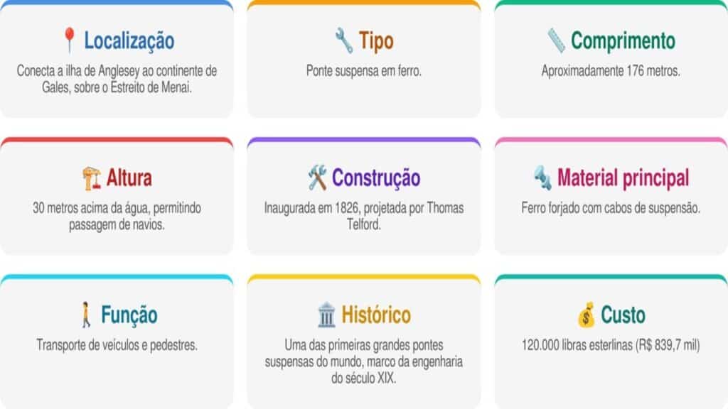 Sua construção foi um marco na Revolução Industrial, permitindo transporte rápido e seguro de carruagens, passageiros e mercadorias, mostrando que a engenharia podia superar desafios naturais. Veja os detalhes técnicos da ponte: