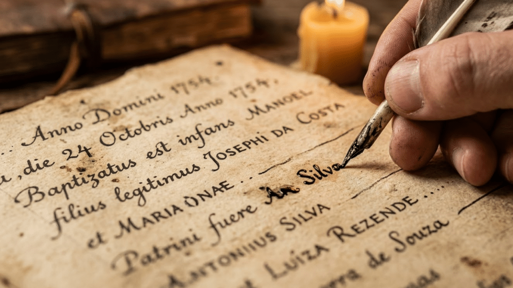 Detalhe de pena escrevendo o sobrenome Silva em um documento antigo de batismo