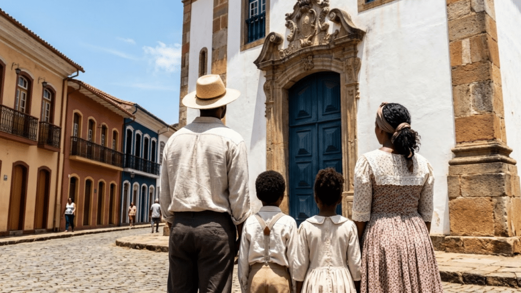 Família brasileira em frente a uma igreja colonial histórica sob sol forte