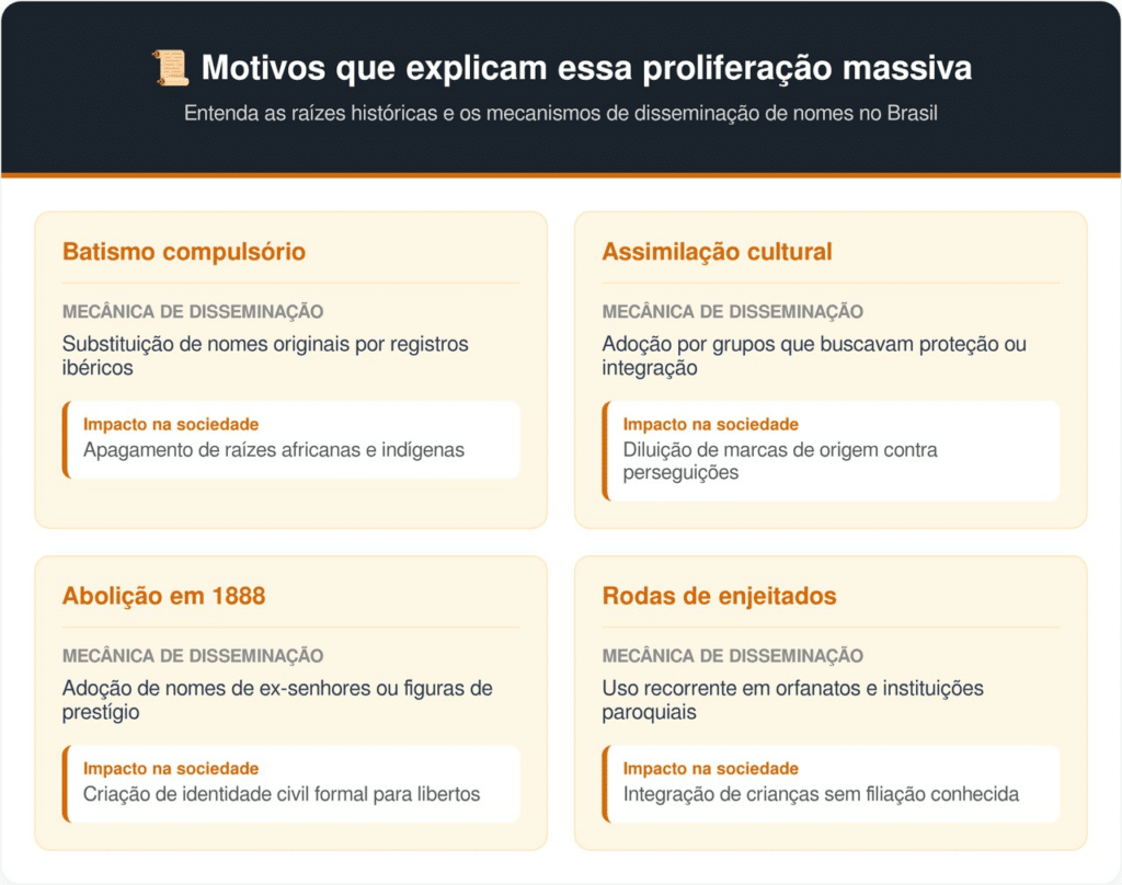 A consolidação desses nomes no patrimônio onomástico nacional decorre de uma combinação de fatores administrativos e sociais. A lógica não foi apenas de parentesco biológico, mas de integração forçada e padronização de registros sob uma matriz europeia.