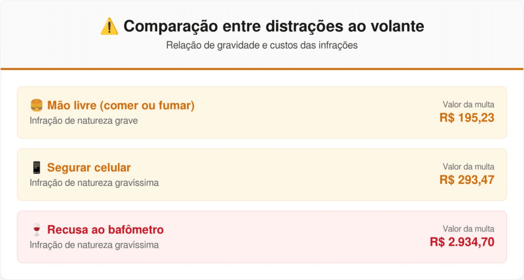 O condutor flagrado cometendo essa imprudência recebe uma multa no valor de R$ 293,47 e a soma de 7 pontos em seu prontuário. Em casos onde a distração resulta em direção perigosa ou acidentes, a situação pode evoluir para um crime de trânsito, conforme o Artigo 309 do código vigente.