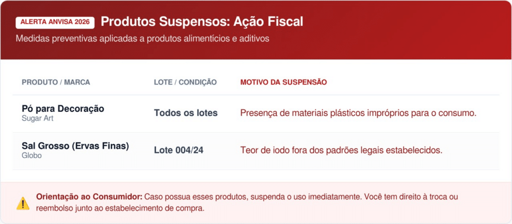 A Anvisa reforça que a fiscalização em 2026 continuará rigorosa para garantir que os alimentos comercializados no Brasil sigam os protocolos de segurança. A interdição desses produtos demonstra que a análise laboratorial é constante, protegendo o cidadão de irregularidades que muitas vezes não são visíveis a olho nu.