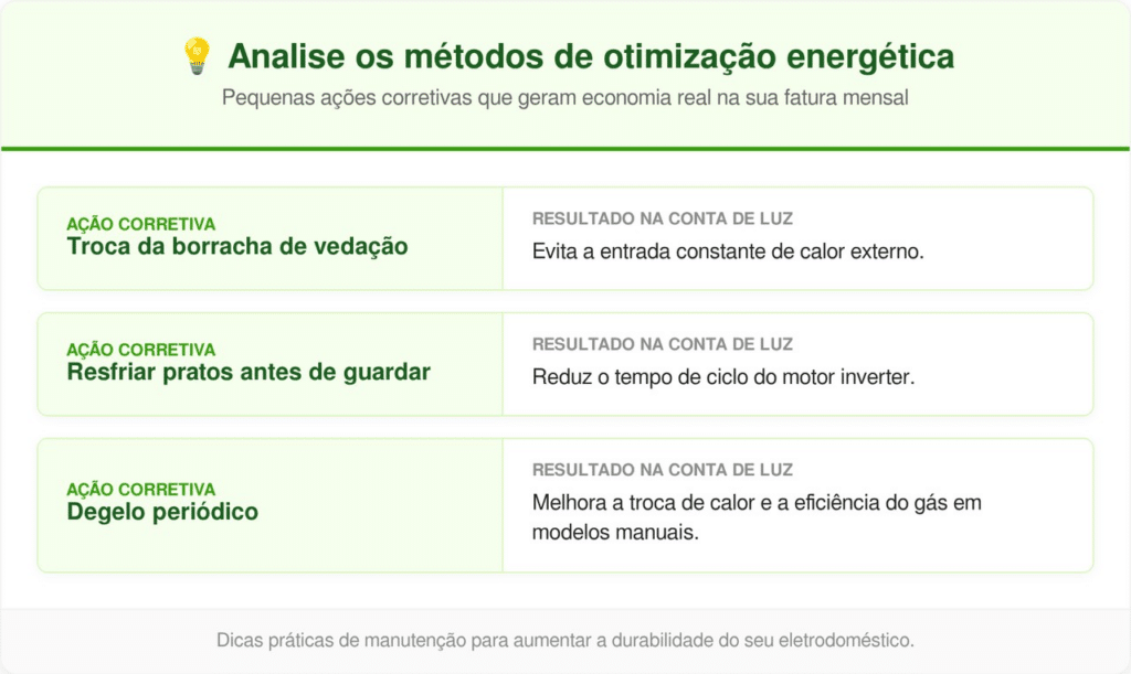 Ao unir o planejamento de retiradas com a manutenção da vedação, você protege seu bolso e o meio ambiente. Pequenas mudanças de comportamento no dia a dia são o segredo para manter a cozinha eficiente e a conta de energia sob controle sem sacrifícios.