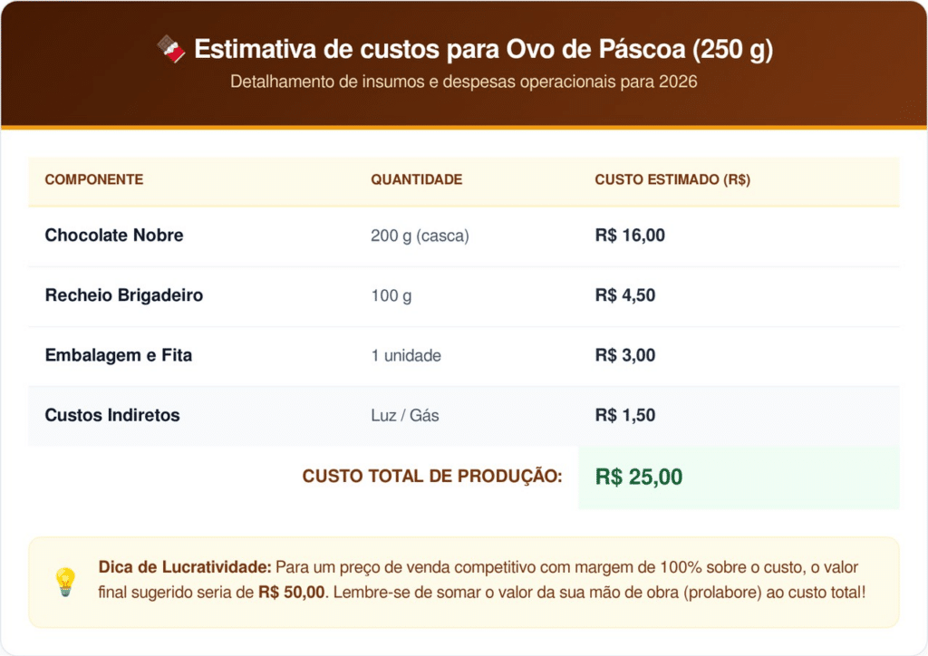O custo médio para fabricar um ovo artesanal de 250 g atualmente varia entre R$ 25 e R$ 45, utilizando chocolate nobre. Para versões gourmet ou ovos de colher, o investimento por unidade pode saltar para a faixa de R$ 80.