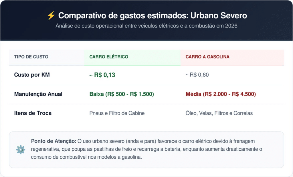 Quem opta por modelos a combustão geralmente foca no preço de aquisição inicial, que costuma ser mais baixo devido à maturidade da cadeia produtiva. No entanto, o custo operacional por quilômetro rodado tende a ser até cinco vezes maior do que o de um carro elétrico em 2026.