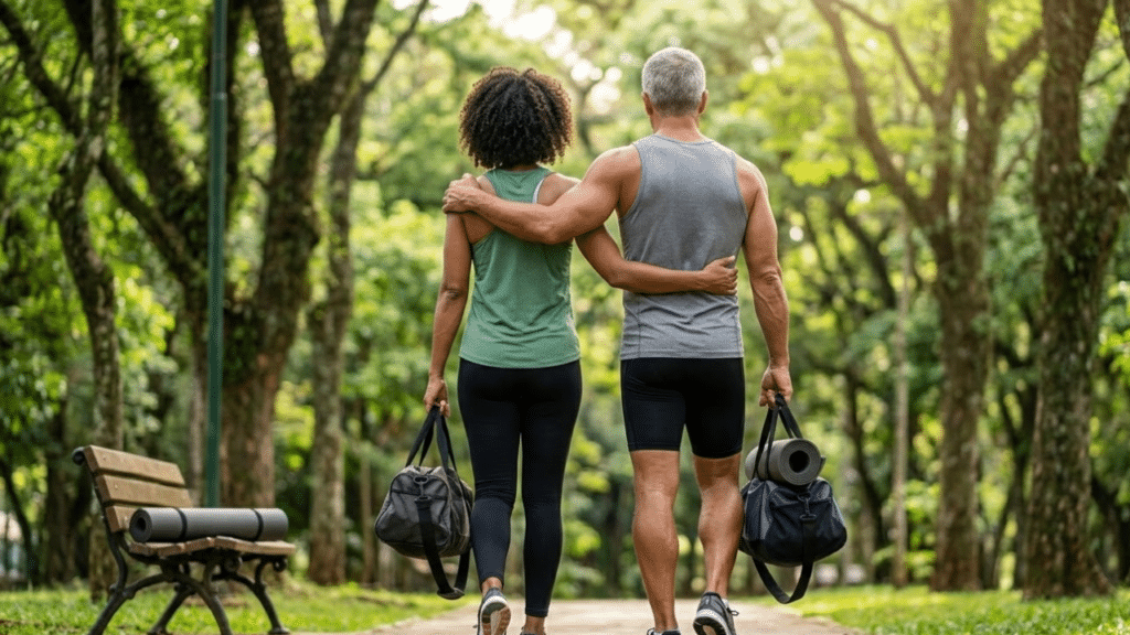 Um casal e em forma caminha por um parque após o treino, celebrando a parceria e o estilo de vida saudável