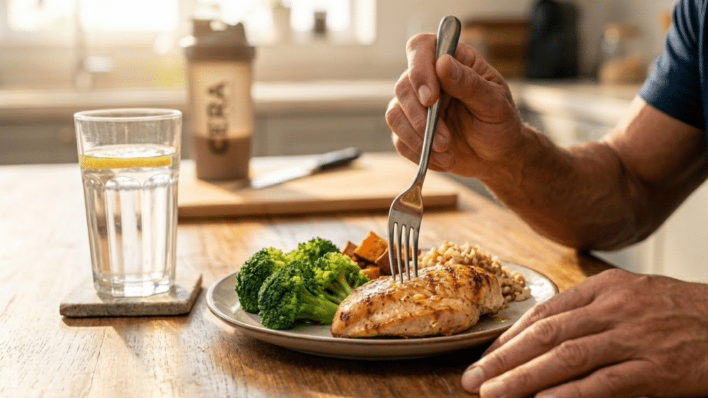Detalhe sensorial de uma refeição pós-treino rica em proteínas e vegetais, essencial para a recuperação muscular e o ganho de massa