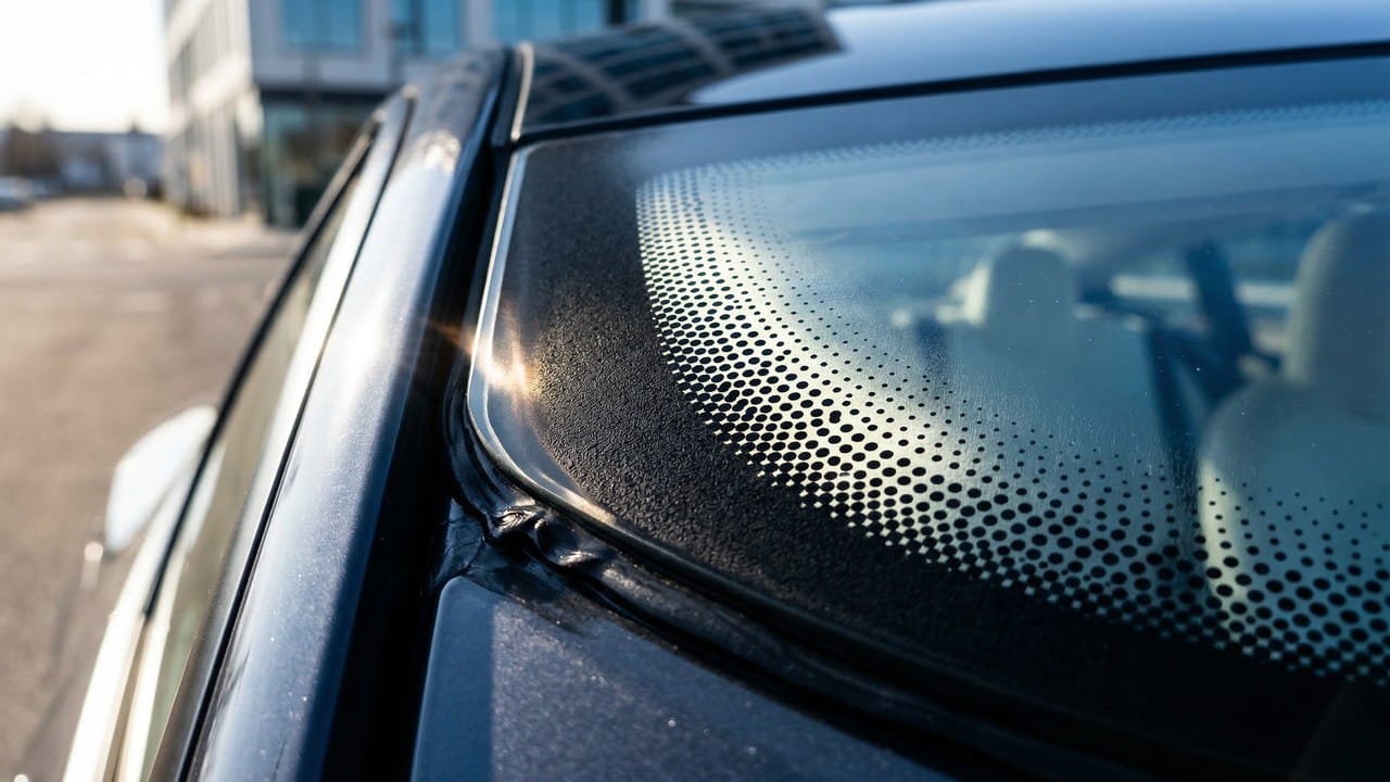 Essa moldura escura e os pequenos círculos que a acompanham são feitos de uma tinta cerâmica extremamente resistente chamada frit. Esses pontos no vidro do carro são fundidos ao material durante o processo de fabricação, criando uma superfície áspera que permite uma aderência perfeita para o selante de uretano.