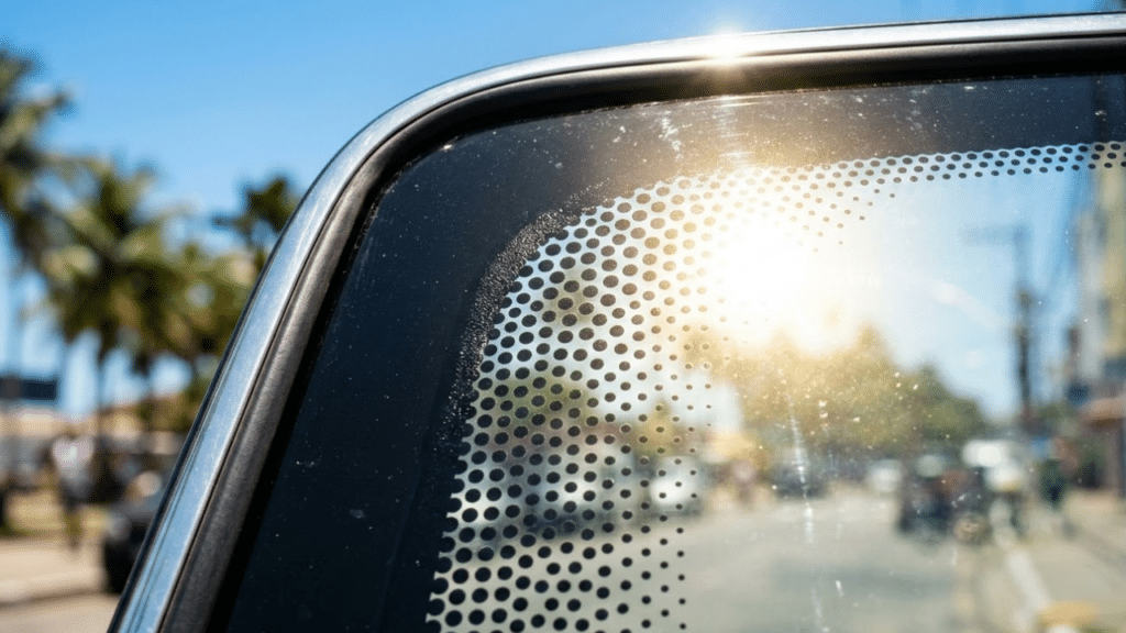 Os pontos no vidro do carro servem para realizar uma transição térmica suave entre a faixa preta sólida e a transparência total. Como o preto absorve calor muito mais rápido que o vidro incolor, essa gradação evita o choque térmico que poderia causar rachaduras estruturais.