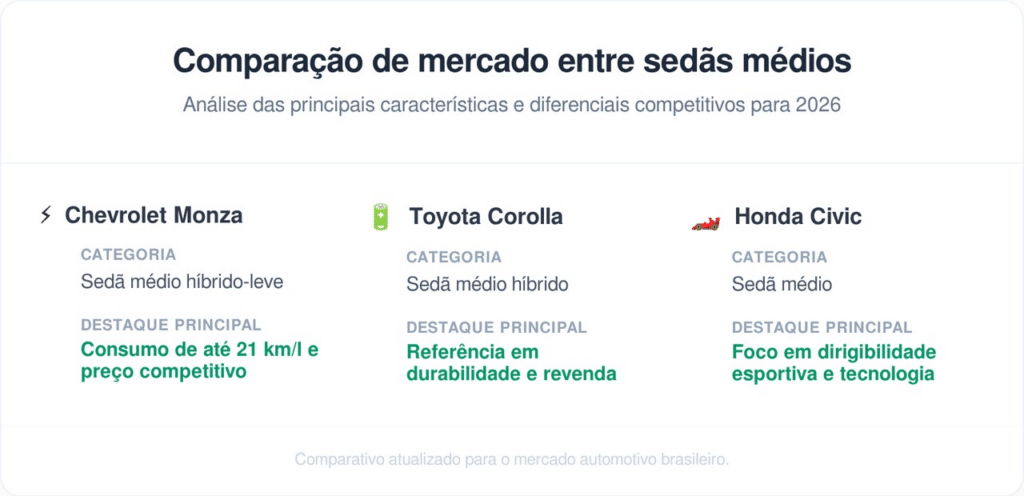 A Chevrolet posiciona o Monza como uma alternativa racional aos líderes tradicionais, como o Toyota Corolla e o Honda Civic. Ao unir o espaço de um sedã médio com a economia de um compacto, a marca busca recuperar sua relevância histórica no mercado global de sedãs.